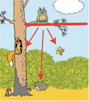 Ёжик находится ниже совы. Он находится ниже белочки. Ёжик находится ниже бабочки.