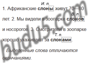 1. Африканские слоны живут 70—80 лет. 2. Мы видели в зоопарке слонов и носорогов. 3. Смотрители в зоопарке хорошо ухаживают за слонами.