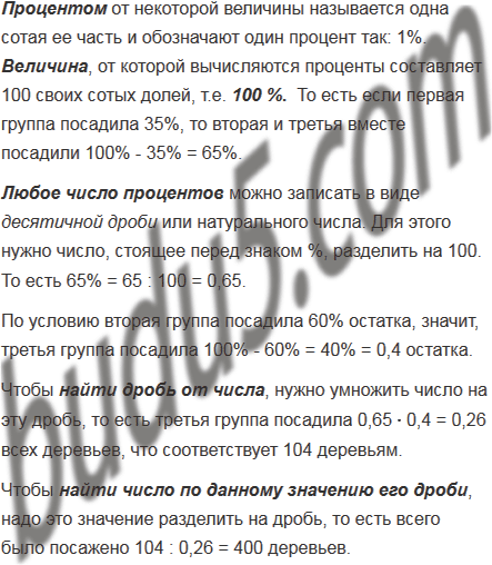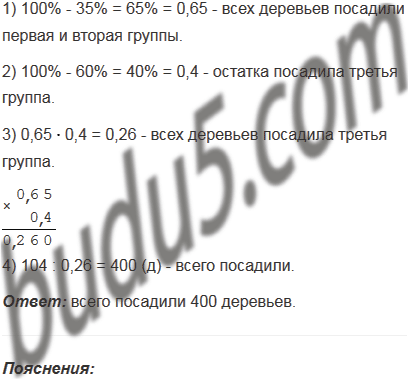 Три группы школьников посадили деревья вдоль дороги. Первая группа посадила 35% всех имевшихся деревьев, вторая - 60% оставшихся деревьев, а третья группа - остальные 104 дерева. Сколько всего деревьев посадили?